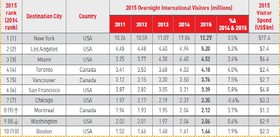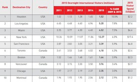 در جدول زیر فهرستی 10گانه از شهرهای آمریکای شمالی که دارای بالاترین نرخ رشد در جذب گردشگر خارجی طی شش سال اخیر بودهاند آمده است: