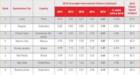 اما در منطقه آمریکای لاتین شهر لیما - پایتخت پرو - با جذب 4.22 میلیون گردشگر پرچمدار جذب گردشگر بینالمللی است که در حد فاصل سال 2014 تا 2015 رشد 7 درصدی در جذب گردشگر خارجی را به ثبت رسانده است.